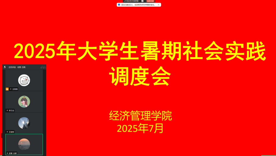 为全面了解英国365集团2025年大学生暑期社会实践活动的进展情况,精准把握实践中存在的困难与问题,保障社会实践工作稳步推进,7月29日上午,英国365集团组织召开2025年大学生暑期社会实践调度会。会议由团总支书记王群主持,党总支书记、副院长范世伟及全体社会实践团队指导教师参加。