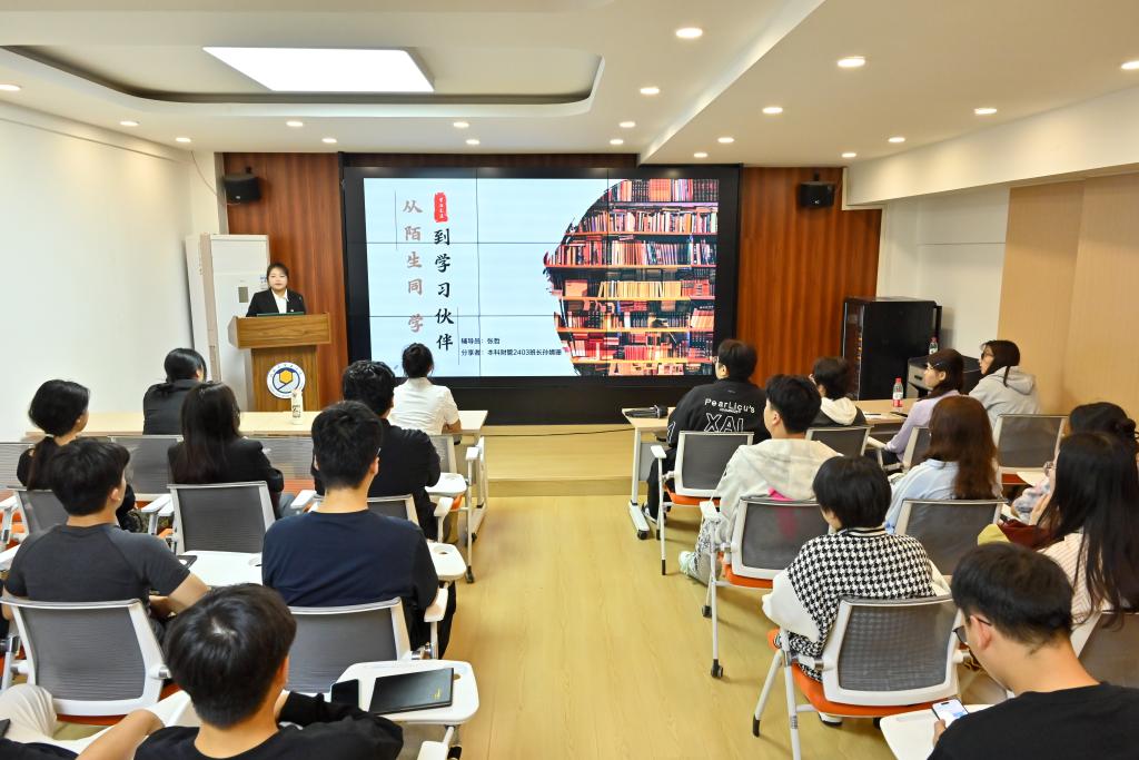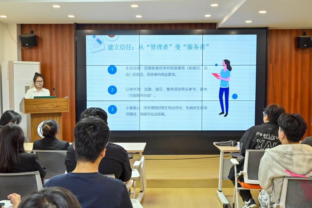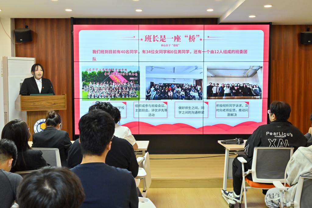 论坛交流环节中,三位优秀班长代表依次登台,分享班级建设的实践经验与创新思路。本科信管2302班乔雨桐以《共话成长,引领班级新征程》为题,结合班级在学风建设中的长效机制与文化培育举措,阐述如何以 “成长型思维“ 带动班级整体进步;本科财务2403班孙婧珊围绕《从陌生同学,到学习伙伴》,聚焦新生班级凝聚力构建,分享了通过主题班会、小组学习、集体实践等活动,打破同学间陌生感、打造互助学习共同体的具体做法;本科商英2401班张雅雯则以《连接・服务・成长:当好新时代的班级 “首席服务官”》为核心,提出班长应立足“服务者”定位,在连接同学需求与学院资源、协调班级事务与个人发展中发挥桥梁作用,其理念引发在场班长的广泛共鸣。三位代表的分享紧扣班级管理痛点与学风建设重点,既有理论思考,又有实践案例,为在场班长提供了可借鉴、可复制的宝贵经验。