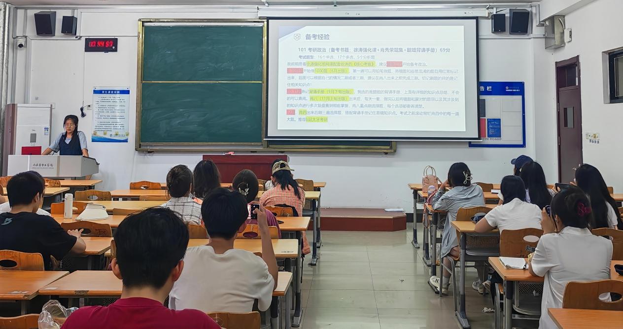 分享会上,何梦婷、刘雨婷、苏晓俊与李帅勇四位在考研中取得优异成绩的毕业生被邀请分享考研经验,他们结合自身扎实的专业知识和成功上岸的实战经验,分别从考研院校及专业的选择、复习资料的筛选与使用、各科复习计划的制定与执行、备考心态的调整与保持等多个方面进行了详细介绍。在院校和专业选择上,何梦婷同学建议大家要结合自身兴趣、职业规划以及院校的招生情况、专业实力等因素进行综合考量;在复习备考环节,李帅勇同学强调了制定科学合理复习计划的重要性,并分享了高效的学习方法和技巧。分享会上还进行了互动,同学们积极踊跃提问,就自己关心的考研问题与学姐学长们进行了深入探讨,并纷纷表示,通过这次分享交流,对考研有了更清晰的认识和更明确的目标。
