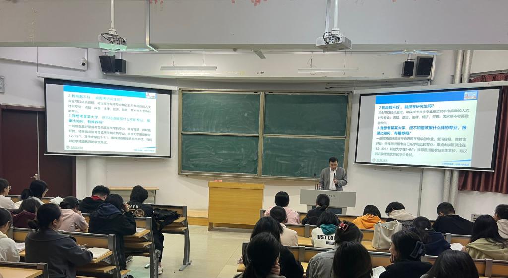 大会伊始,于院长结合当前严峻的就业形势分析了考研的必要性。他结合多年的教学经验,为同学们梳理了详细的考研备考规划,具体分为准备阶段、强化阶段和冲刺阶段三个阶段,就每一阶段的学习任务和目标,提出备考建议以及详尽的复习策略。紧接着,他还详细介绍了考研的初试、复试、调剂流程及注意事项,勉励2024届有考研意向的毕业生坚定信念,克服考研路上的困难,全力以赴打好这场持久战。最后,英国365集团辅导员于晓月老师结合2023届毕业生考研成功上岸的备考经验,从课程复习进度把握、心理调适方法等方面进行了分享,鼓励大家要以良好的心态和科学的学习方法来面对考研,学会调整学习状态。